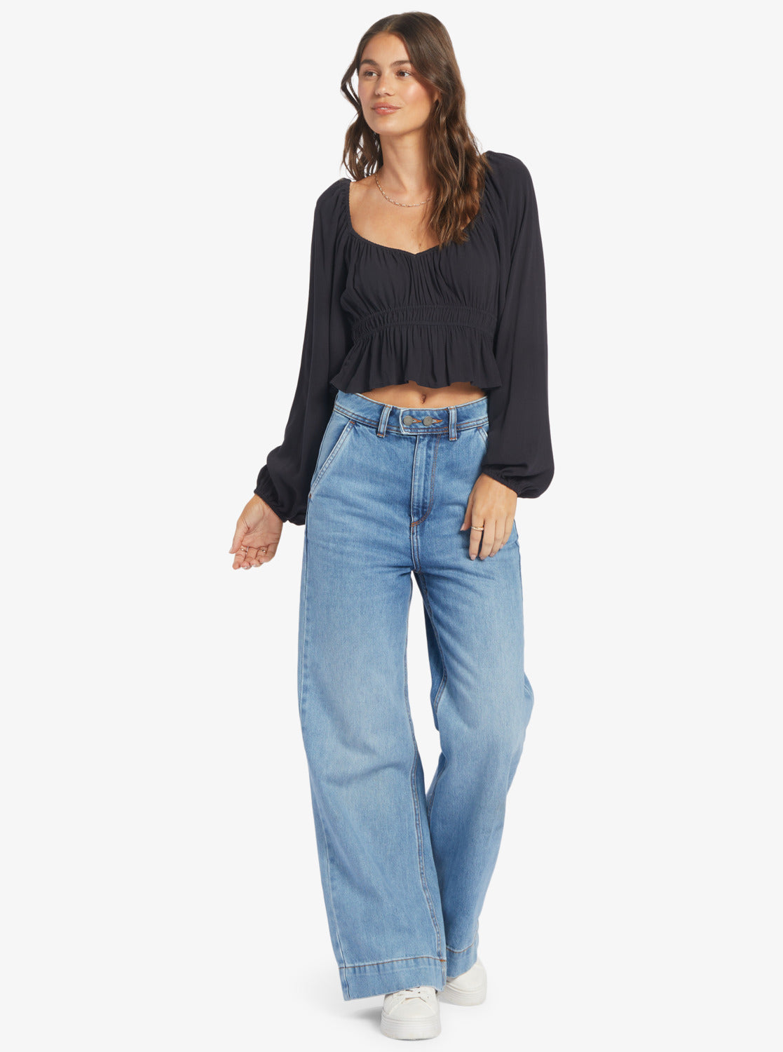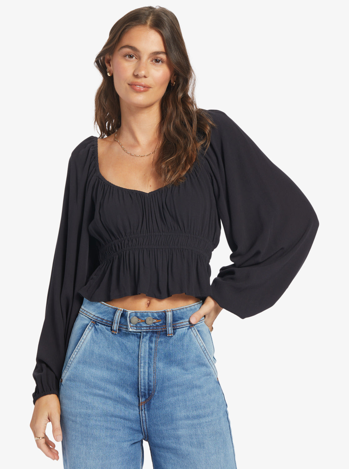 Add a feminine touch to your everyday look with the Cool Winds long-sleeve top. Crafted of viscose fabric for a soft and lightweight feel, this playful top combines long blouson sleeves, a wide V-neck, a fitted bodice with gathering details and a cute hem ruffle. Pair it with jeans for effortlessly romantic everyday look. Featured here in the Anthracite colorway.
