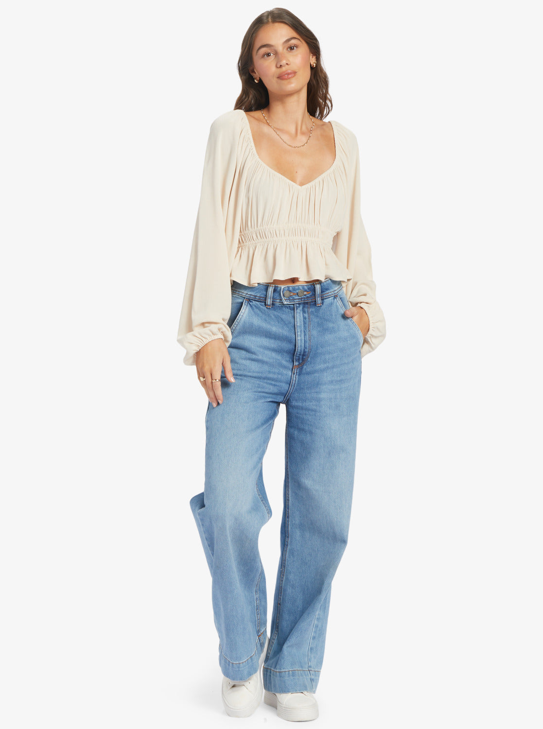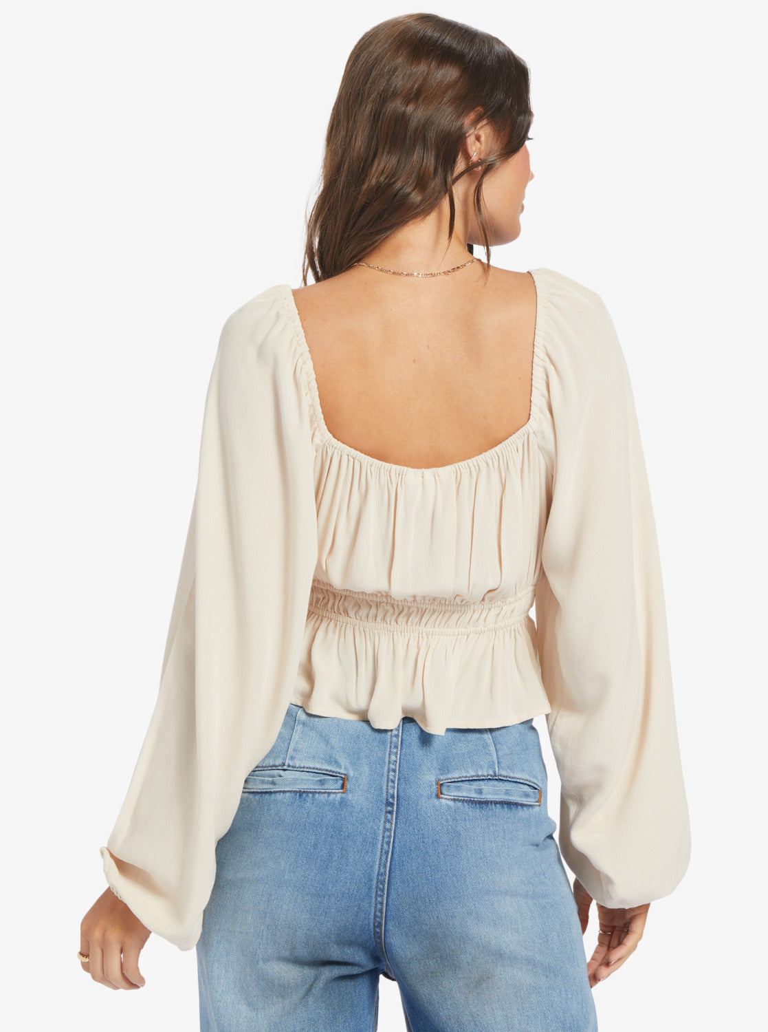 Add a feminine touch to your everyday look with the Cool Winds long-sleeve top. Crafted of viscose fabric for a soft and lightweight feel, this playful top combines long blouson sleeves, a wide V-neck, a fitted bodice with gathering details and a cute hem ruffle. Pair it with jeans for effortlessly romantic everyday look. Featured here in the Tapioca colorway.